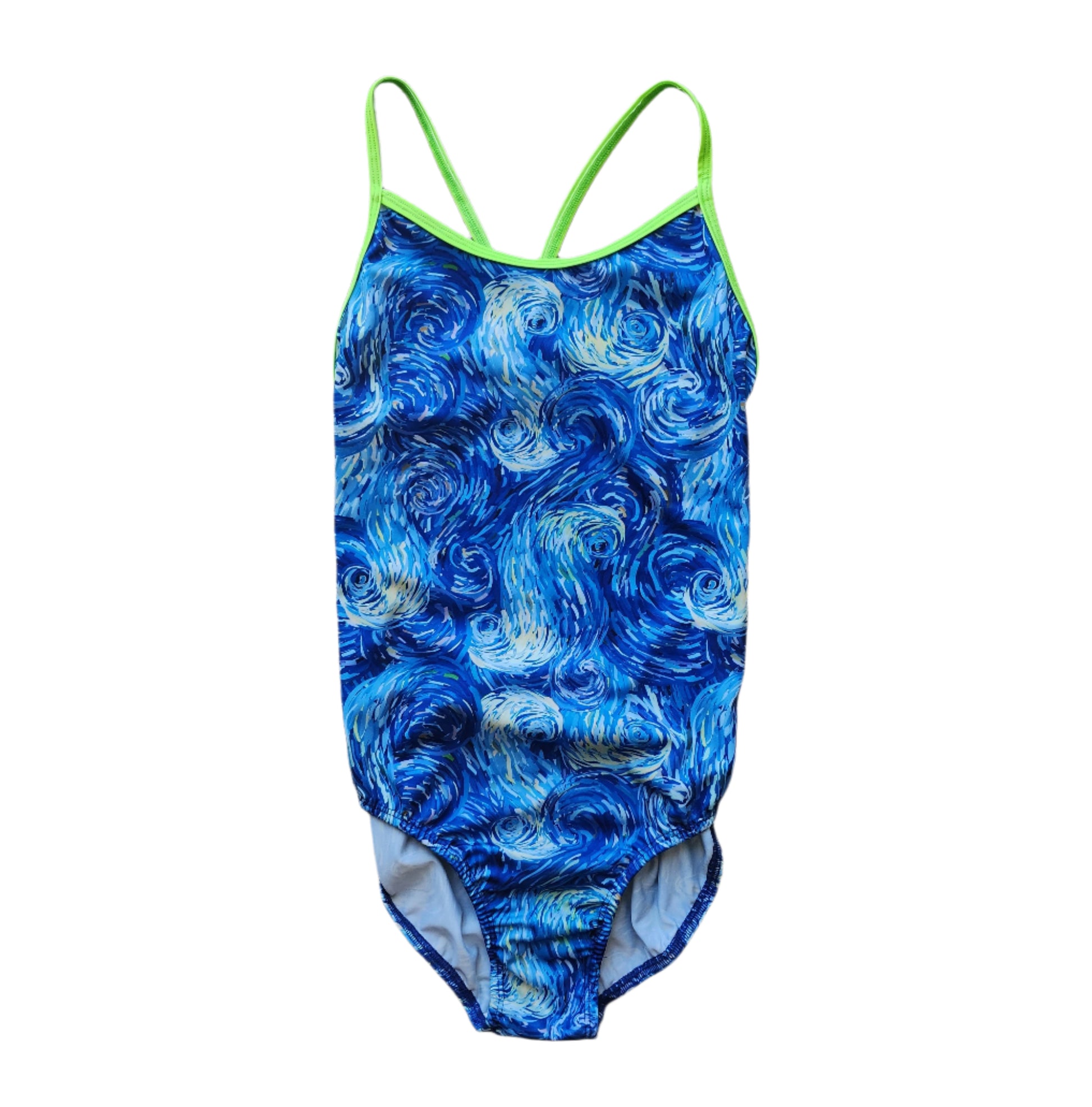 This Kikx full body thin strap swimsuit for ladies and girls comes in a Van Gogh design with neon green straps and is made from Extra Life lycra to outlast ordinary lycra so you can love your costume even longer!