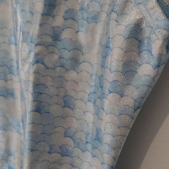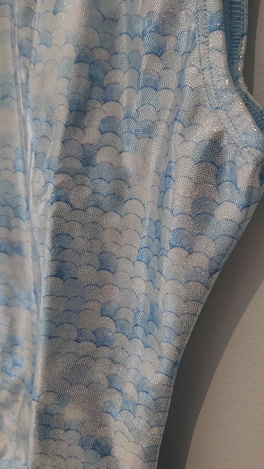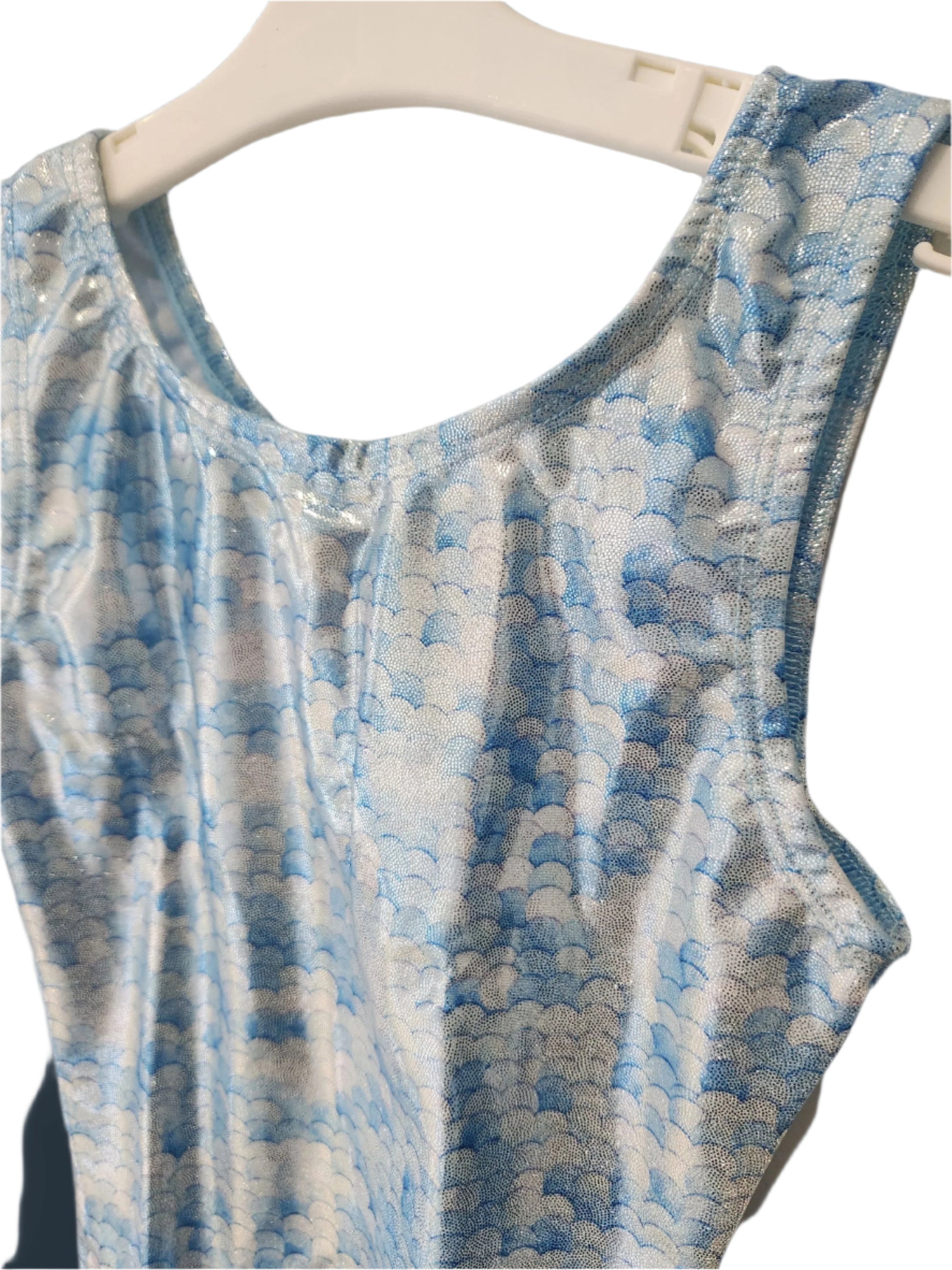 Enjoy style and freedom of movement in our standard tank cut, sleeveless Kikx gymnastics leotard which comes in mystique blue & white sequins design shimmering fabric.