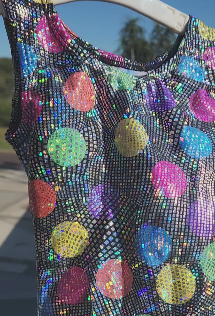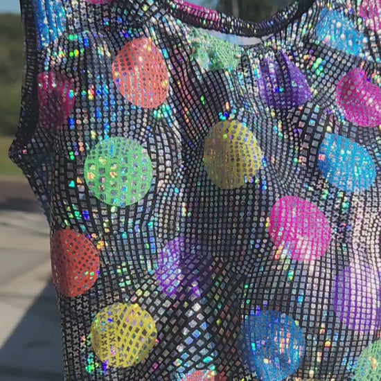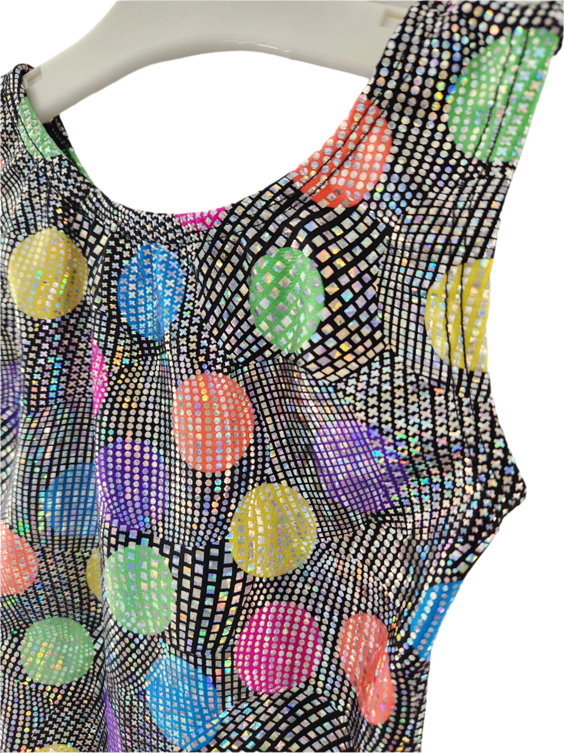 Enjoy style and freedom of movement in our standard tank cut, sleeveless Kikx gymnastics leotard which comes in a hologram with multi colour dots design shimmering fabric.