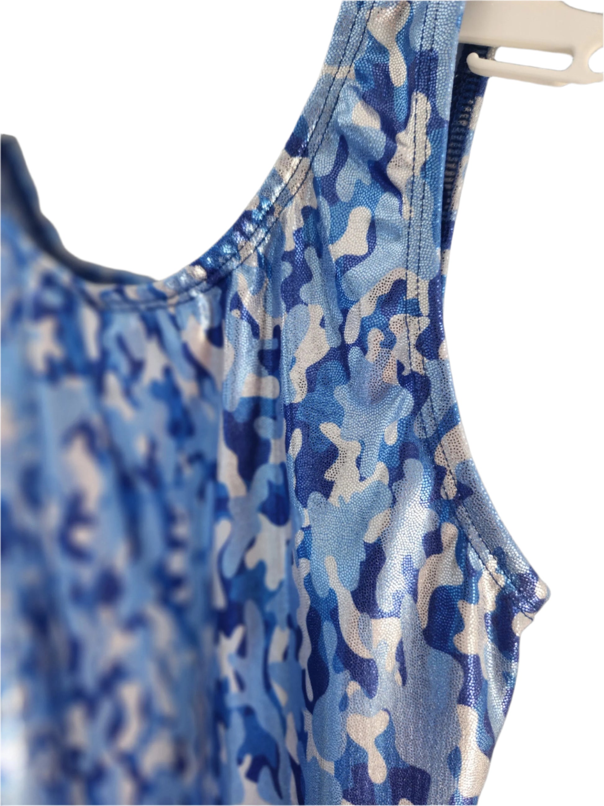 Enjoy style and freedom of movement in our standard tank cut, sleeveless Kikx gymnastics leotard which comes in mystique navy army camo design shimmering fabric.