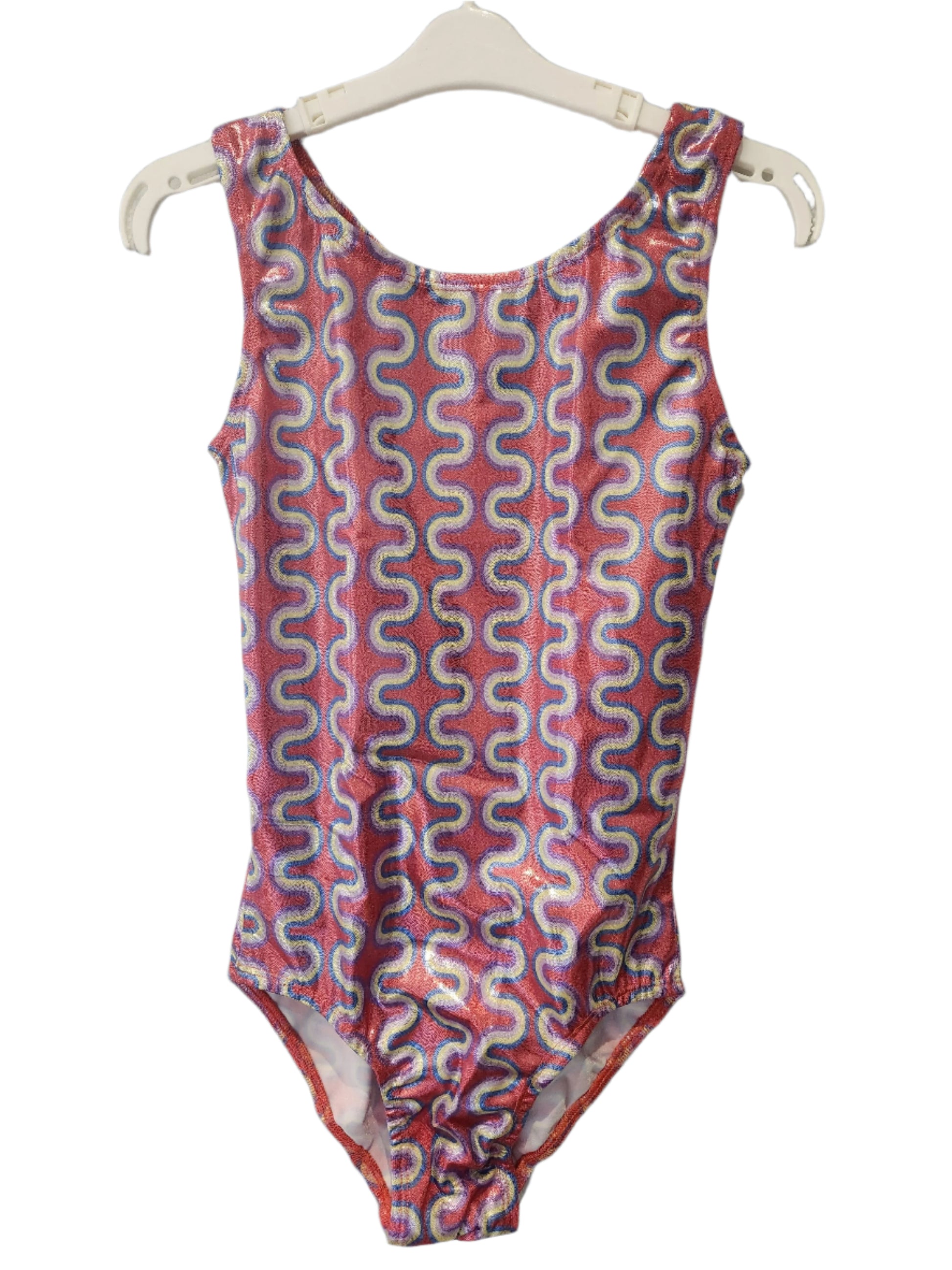 Enjoy style and freedom of movement in our standard tank cut, sleeveless Kikx gymnastics leotard which comes in mystique 70's retro wiggles design shimmering fabric.